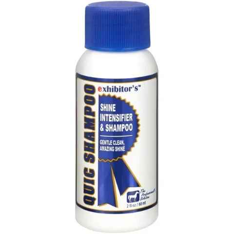 De gloednieuwe, baanbrekende technologie van Exhibitor's Quic Shampoo is een oplossing voor het versterken van de glans van paardenhaar.
